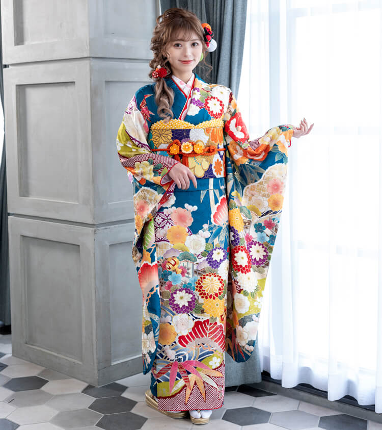 伝統的な古典柄を描きながらも、ポップな雰囲気で着こなせる青い振袖はこちらです。