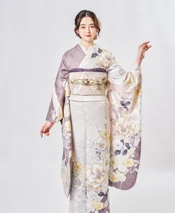 落ち着いたピンクブラウンとクリームの味わいが調和し、椿と桜の柄が上品でありながら可愛い雰囲気を持ち、成人式という特別な場にぴったり。