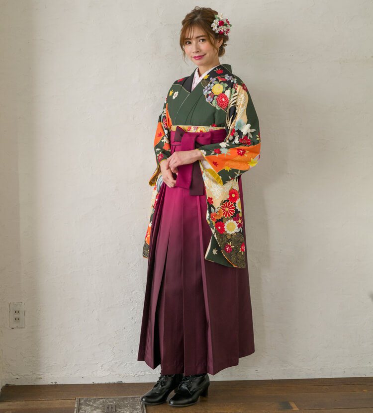 今人気のレトロモダン、鮮やかな着物に茶色の袴で清楚な印象を与えます。ビタミンカラーの着物との相性が非常によく、上品な色使いは、オシャレ女子に必見!