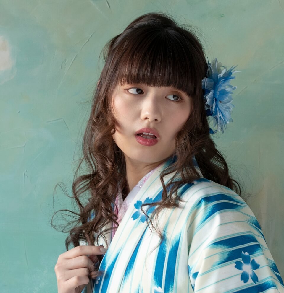 こちらは重めの前髪と、くるくるに巻かれたダウンヘアで現代版ハイカラ少女に。