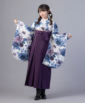 深みのある群青色にボタニカル柄をあしらった「群青ボタニカル」の着物に、上品な紫の袴を合わせたモダンで大人っぽいコーディネートです。