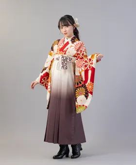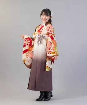 白地に赤の大きな菊柄が華やかに描かれた「白赤に大菊」の着物に、クリームから茶色へと美しくグラデーションしたチャイロクリームぼかし紐水玉の袴を合わせたレトロモダンコーディネートです。