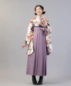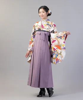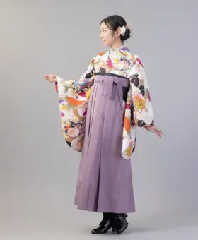 くすみ感のあるパープルの袴は、甘くなりすぎず、洗練された印象に仕上げてくれるのが魅力。