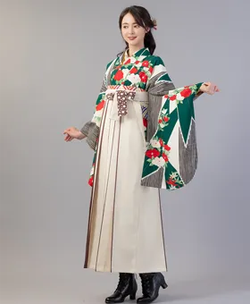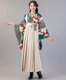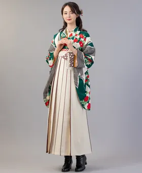 白と緑を基調に短冊や牡丹、椿が描かれた「白緑短冊牡丹椿」の着物に、クリームライン紐水玉の袴を合わせたレトロモダンコーディネートです。