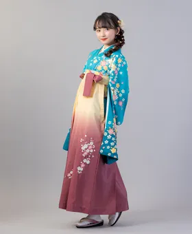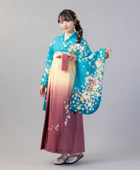 鮮やかなエメラルドグリーンに桜と鈴のモチーフが描かれた「エメラルドグリーン桜・鈴」の着物に、クリームからあずき色へとグラデーションした「クリームあずきぼかし桜」の袴を合わせた個性的なコーディネートです。