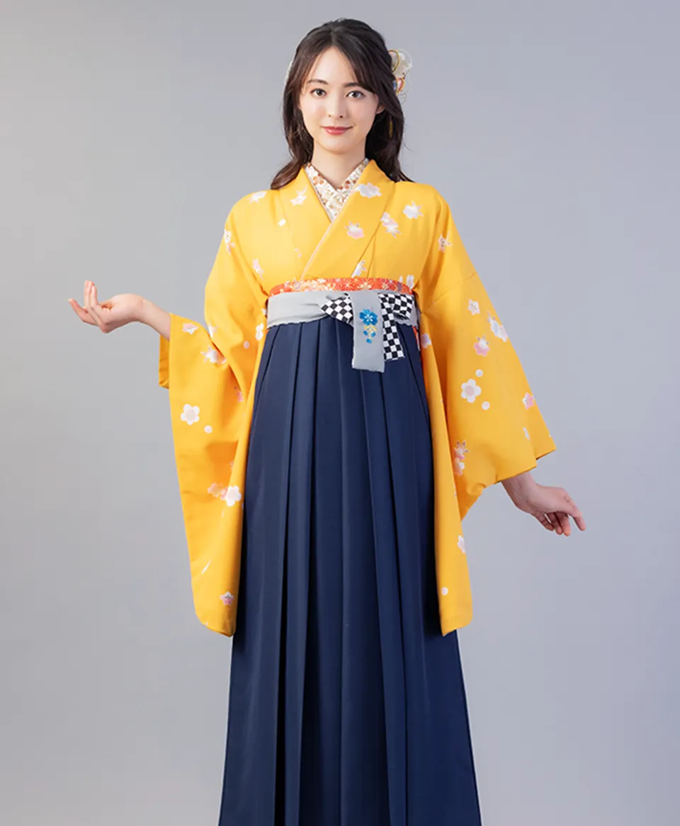 やわらかな黄色地に小桜があしらわれた着物に、落ち着いたコン紐格子サクラ刺繍の袴を合わせた、明るく上品なコーディネートです。
